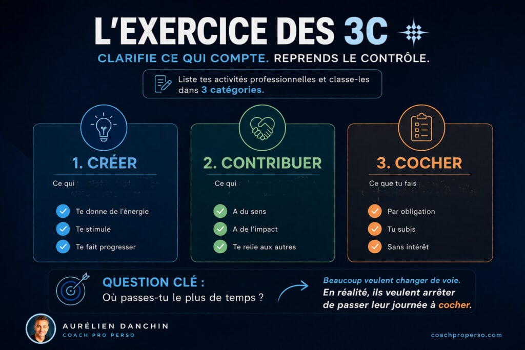 Cet exercice des 3C te permet de prendre conscience d’un point essentiel : ce n’est pas toujours ton métier qui pose problème, mais la répartition de ton temps à l’intérieur de ce métier. Beaucoup pensent vouloir changer de voie. Mais en réalité, ils veulent surtout arrêter de passer leur journée à cocher des cases ou à remplir des critères pour être reconnus.